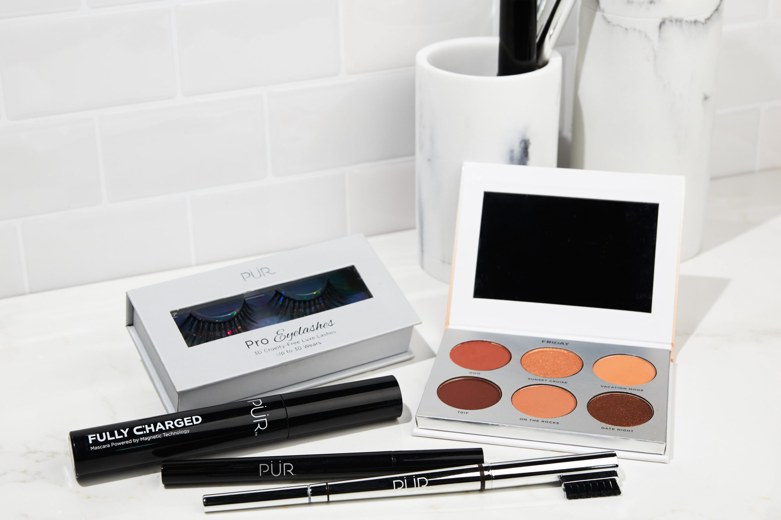 On Point Eyeshadow Palette, Fully Charged Mascara, Fully Charged Primer, On Point Waterproof Liquid Eyeliner Pen, Arch Nemesis (dark), PRO Eyelashes.bathroom props.marble- 300