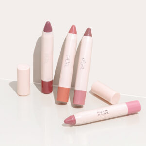 Silky Pout Lip Chubbys – Caps off Leaning and laying on split cream wall-2000